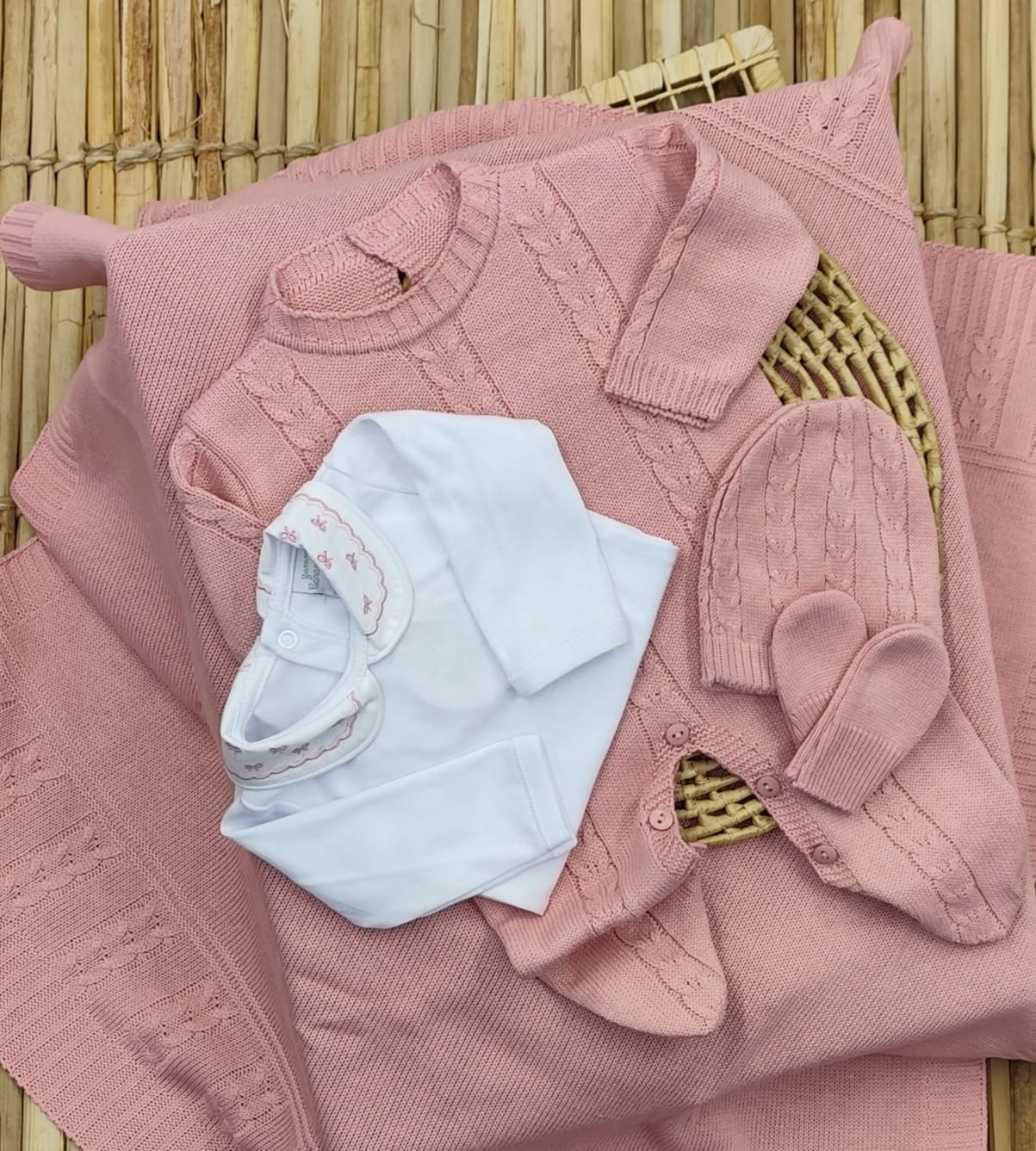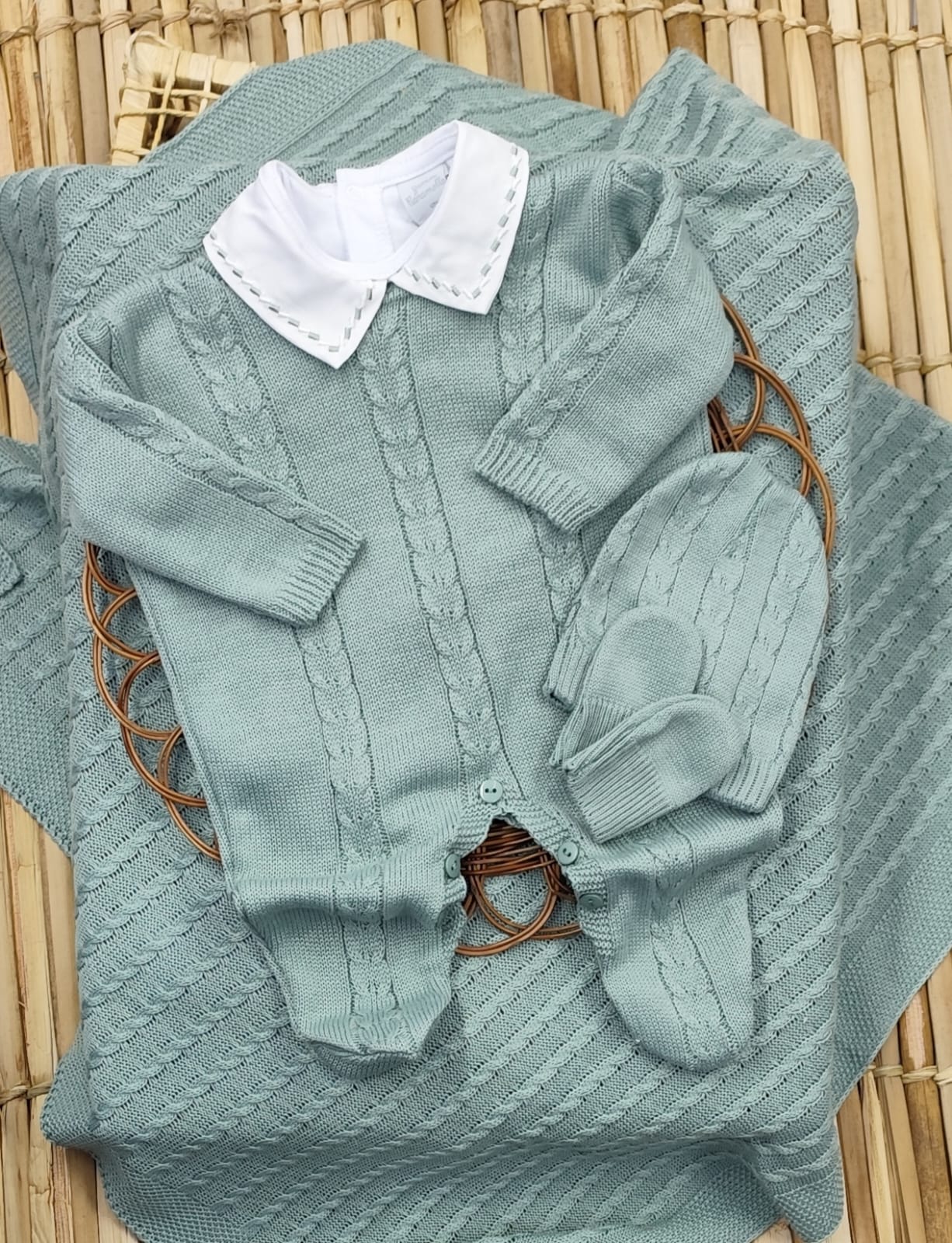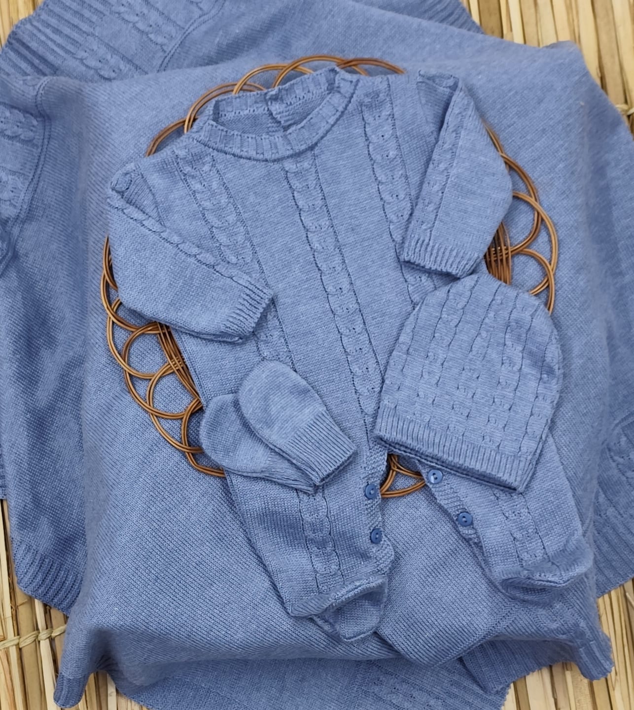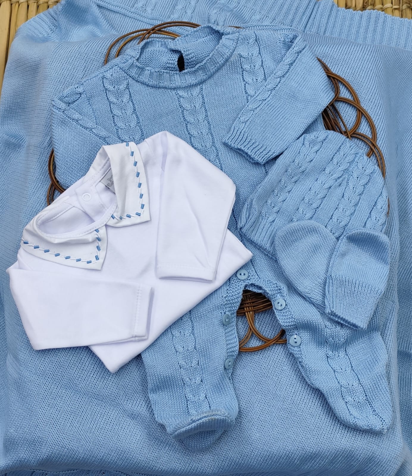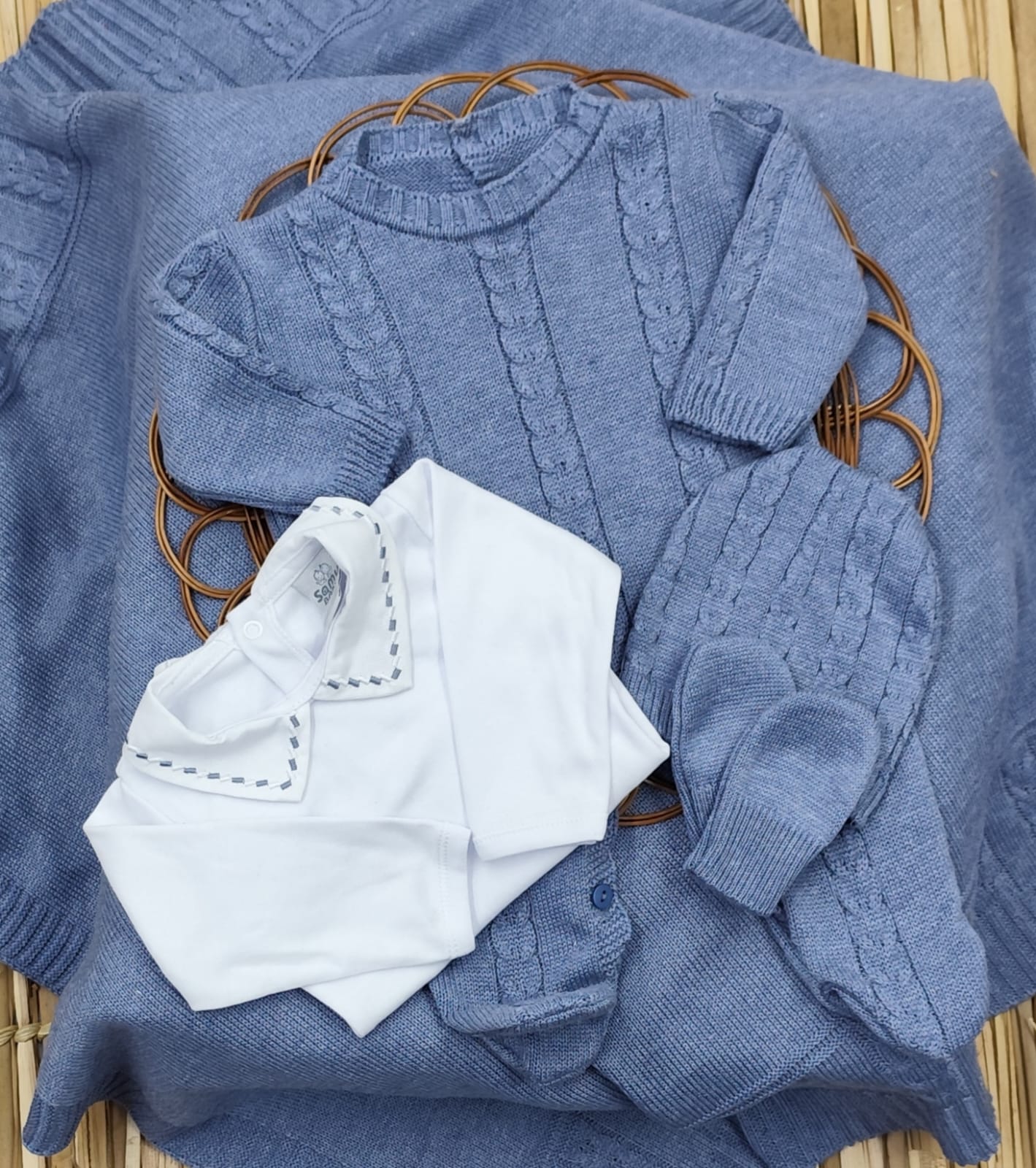 Kit Saída de Maternidade em Tricot – macacão, body com gola bordada, touca, luvas e manta.