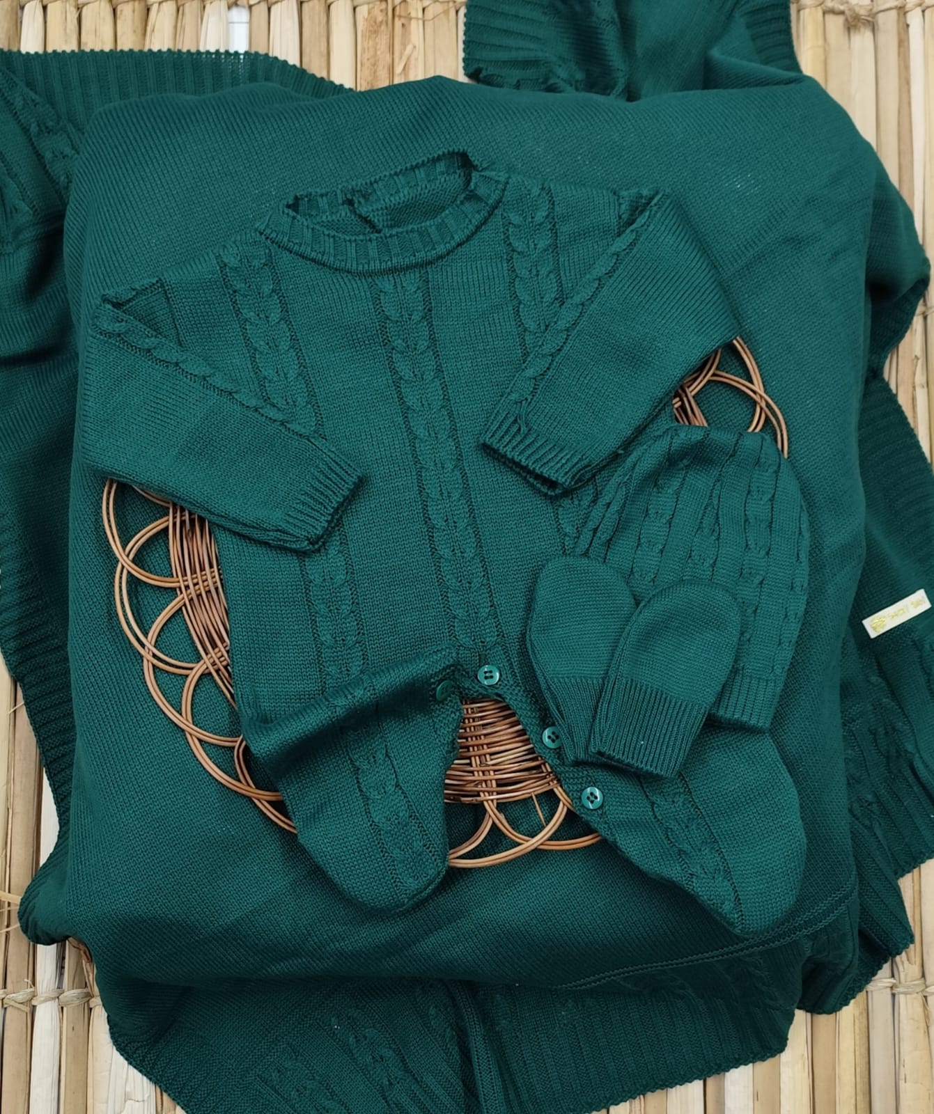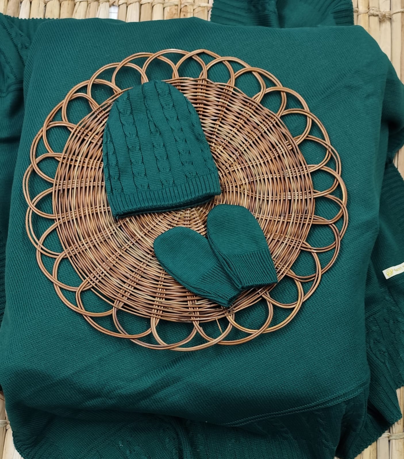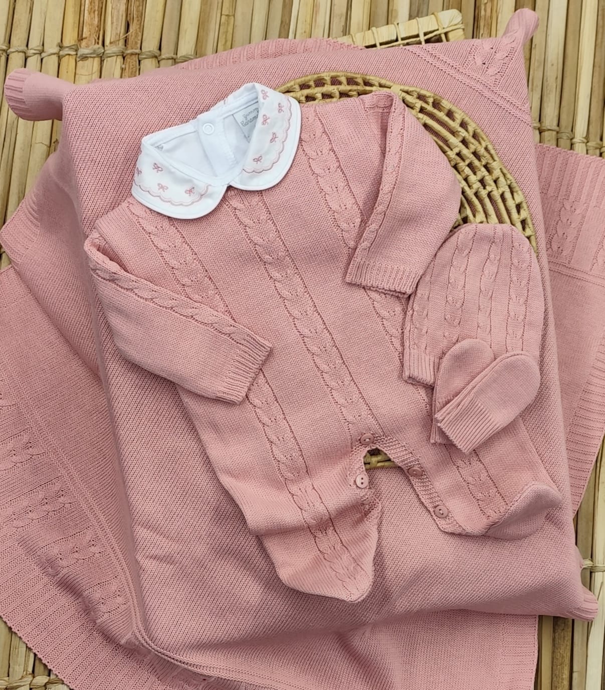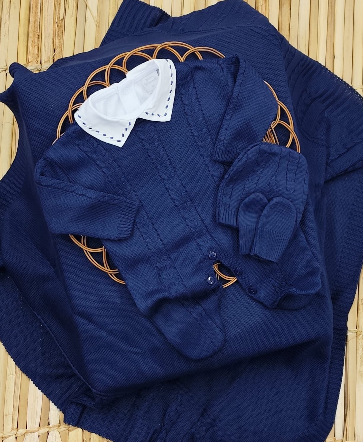 Kit Saída de Maternidade em Tricot – macacão, body com gola bordada, touca, luvas e manta.