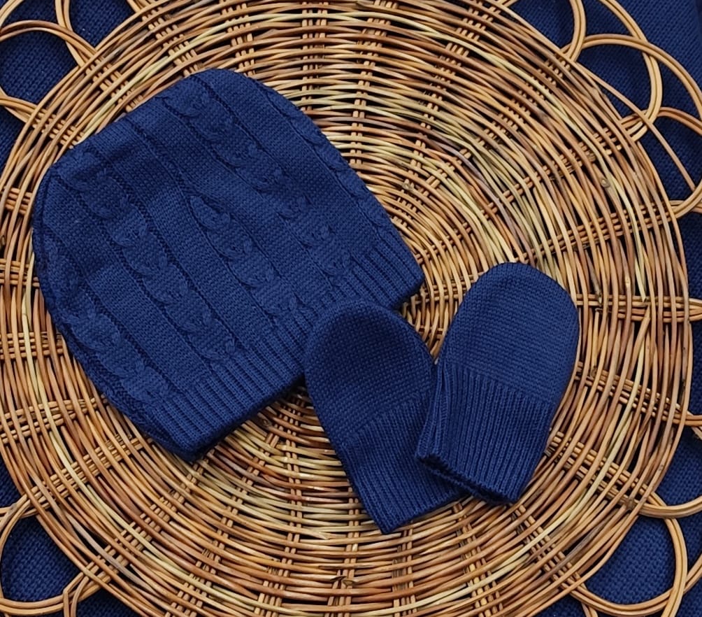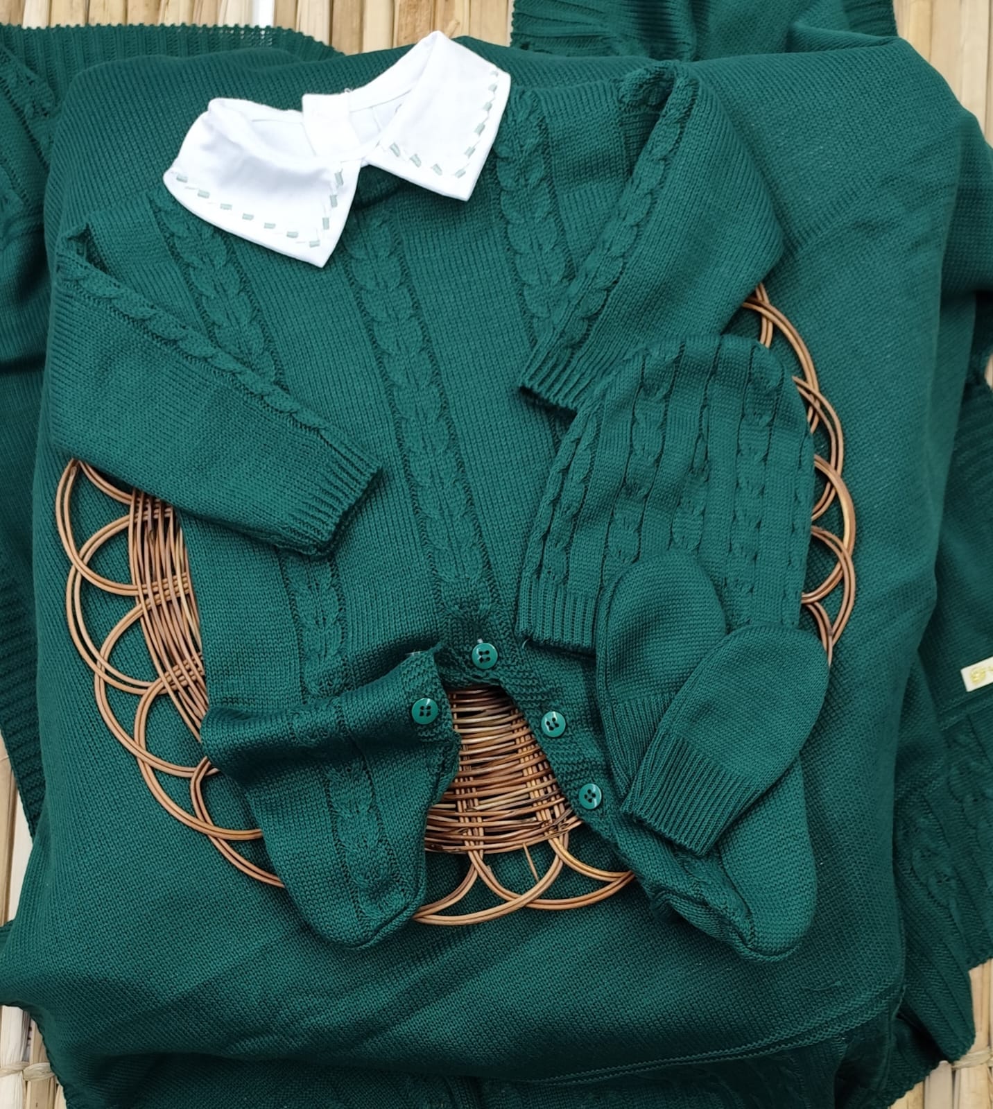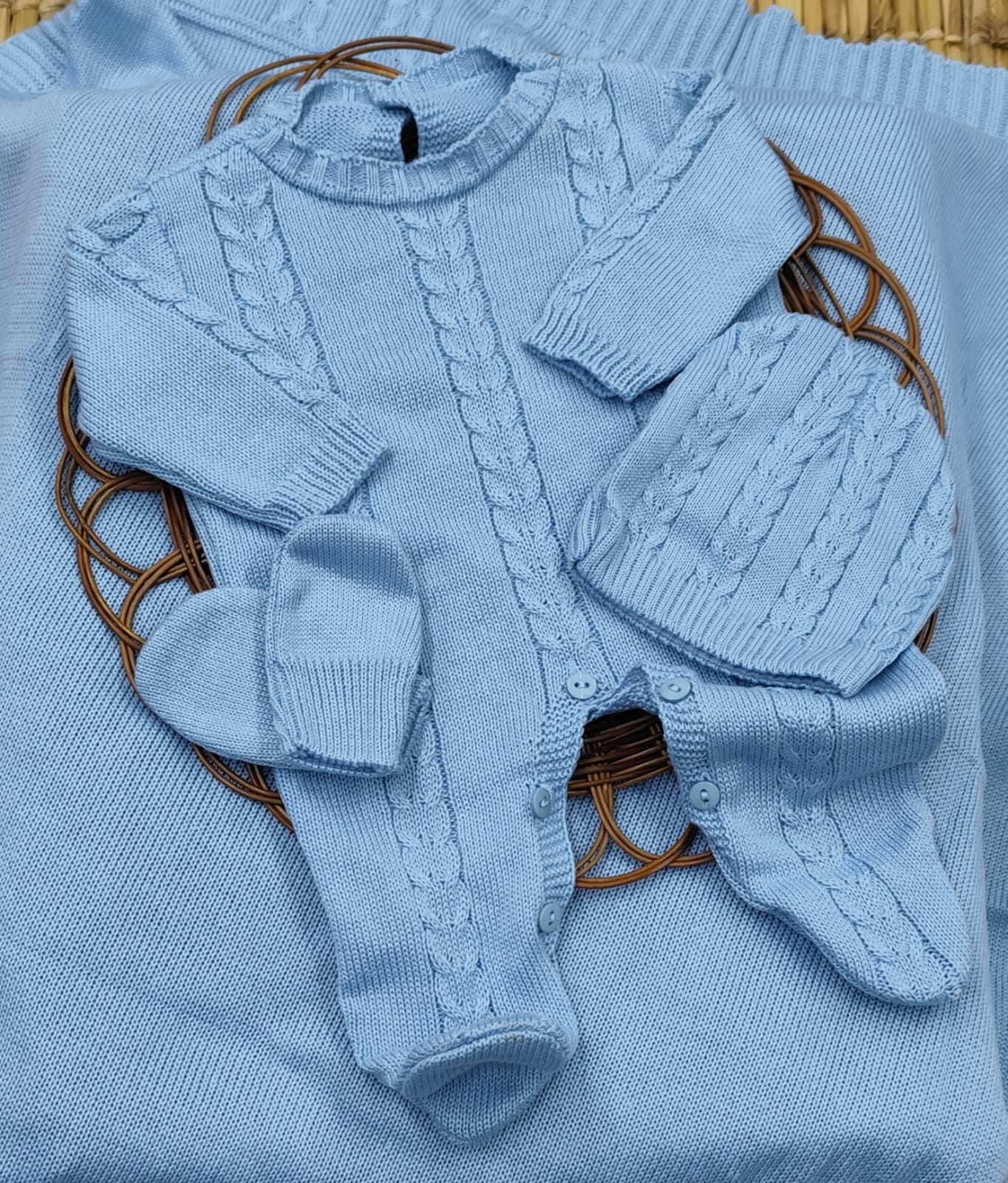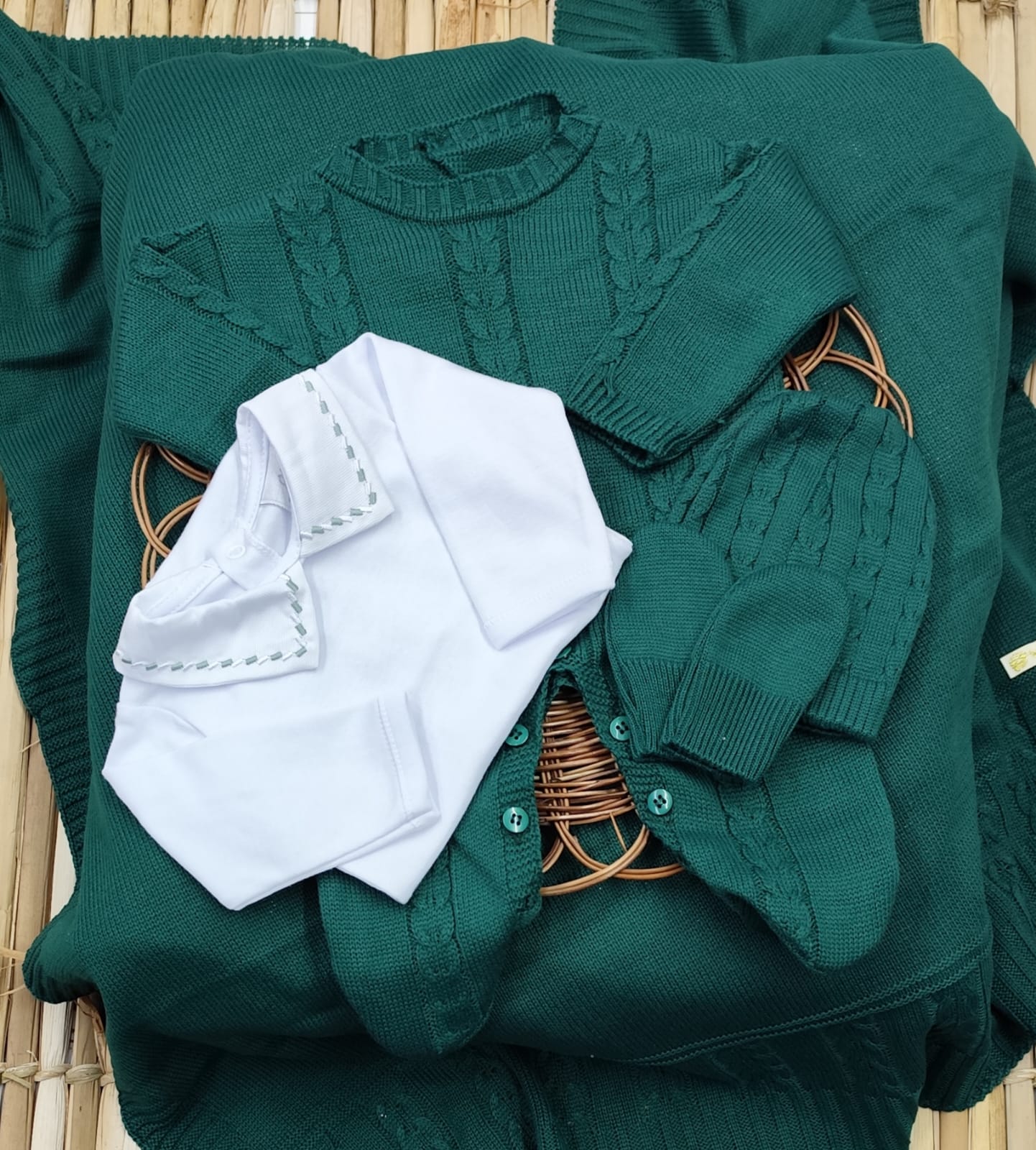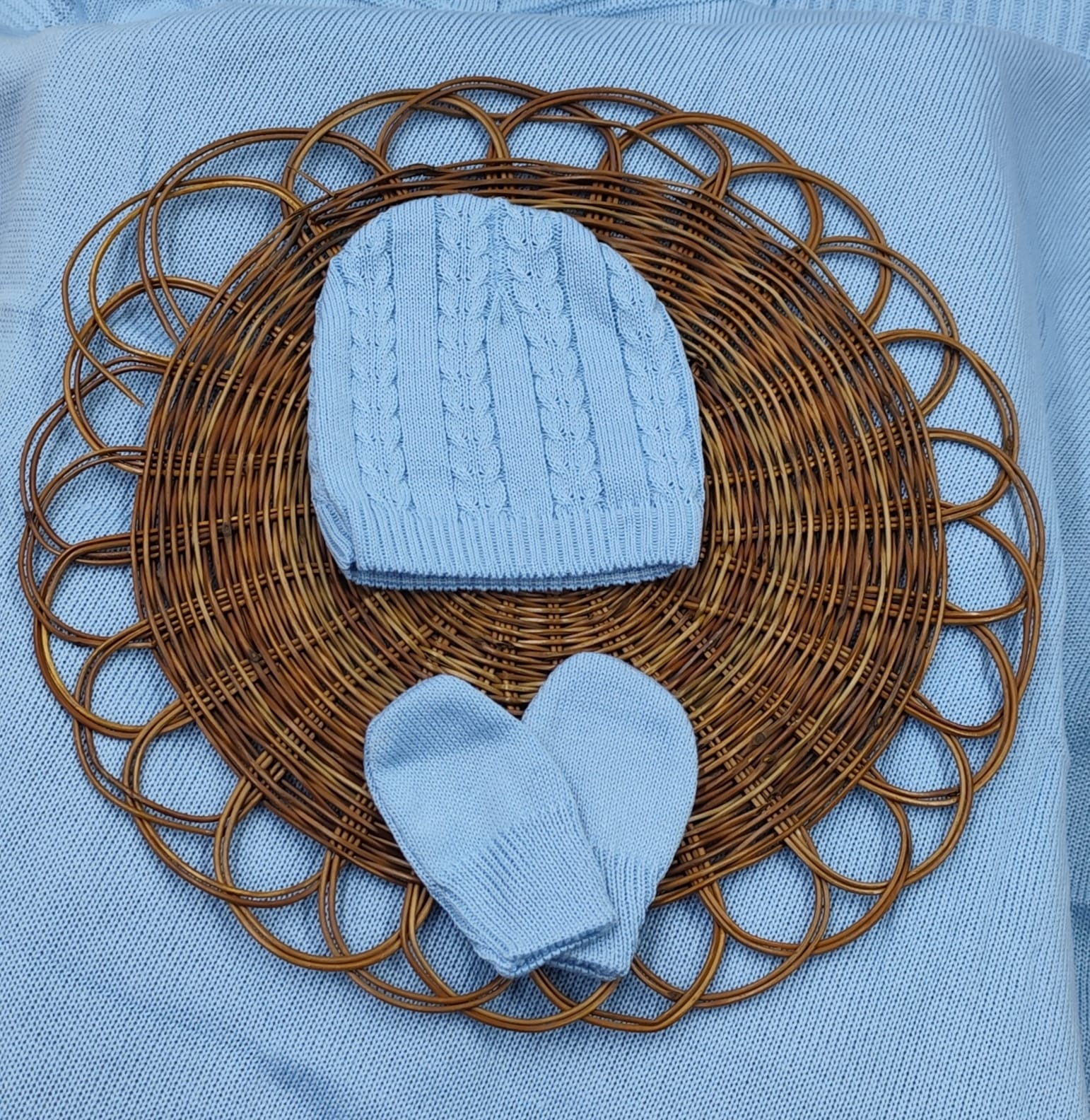 Kit Saída de Maternidade em Tricot – macacão, body com gola bordada, touca, luvas e manta.