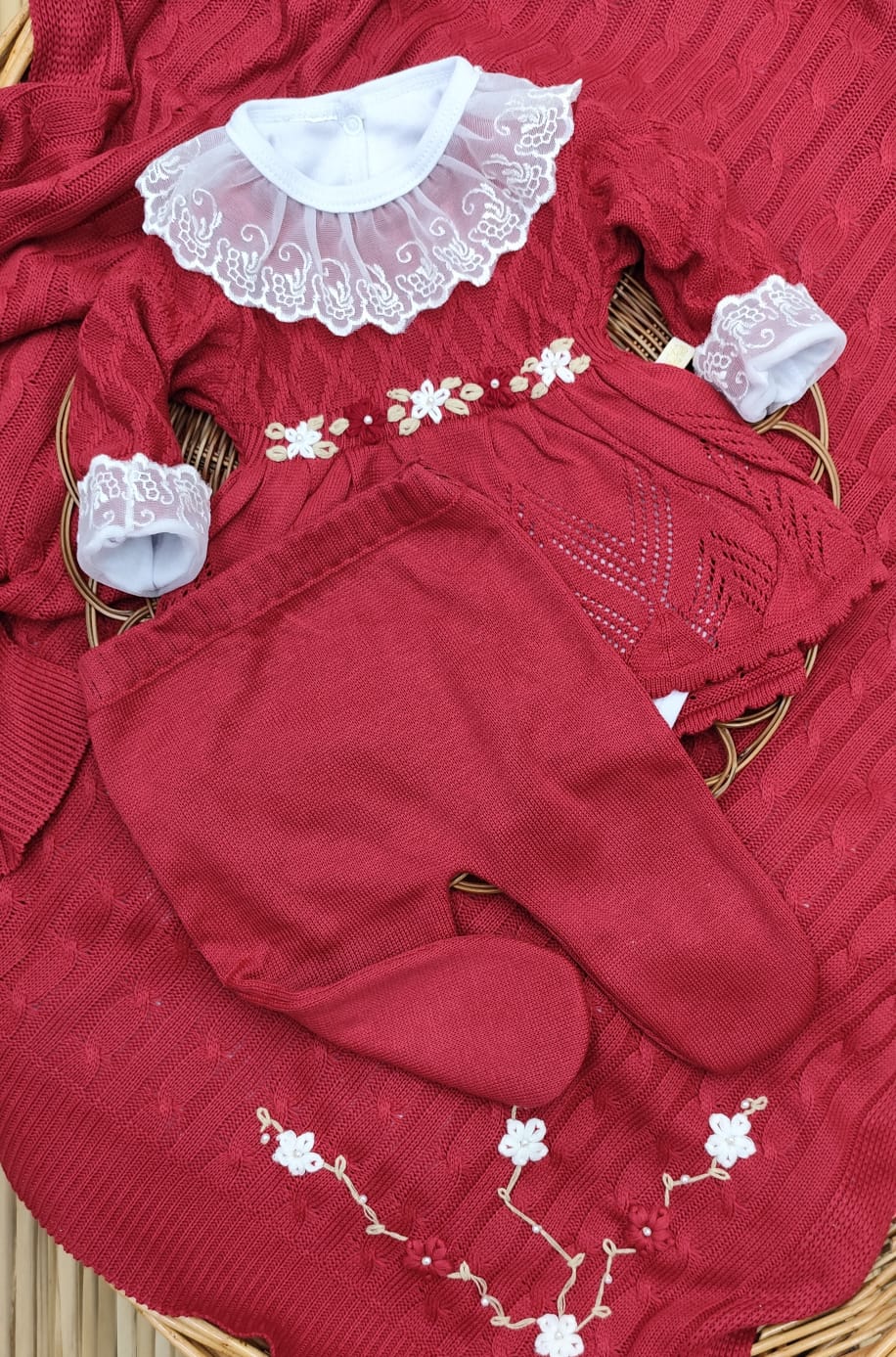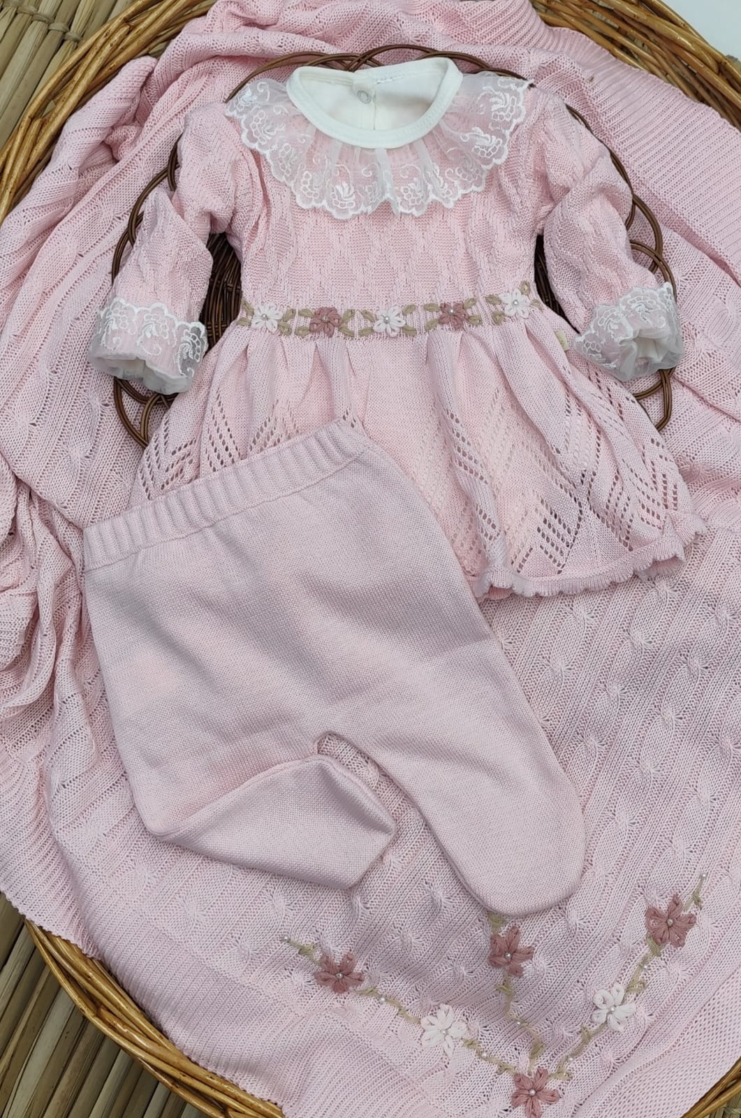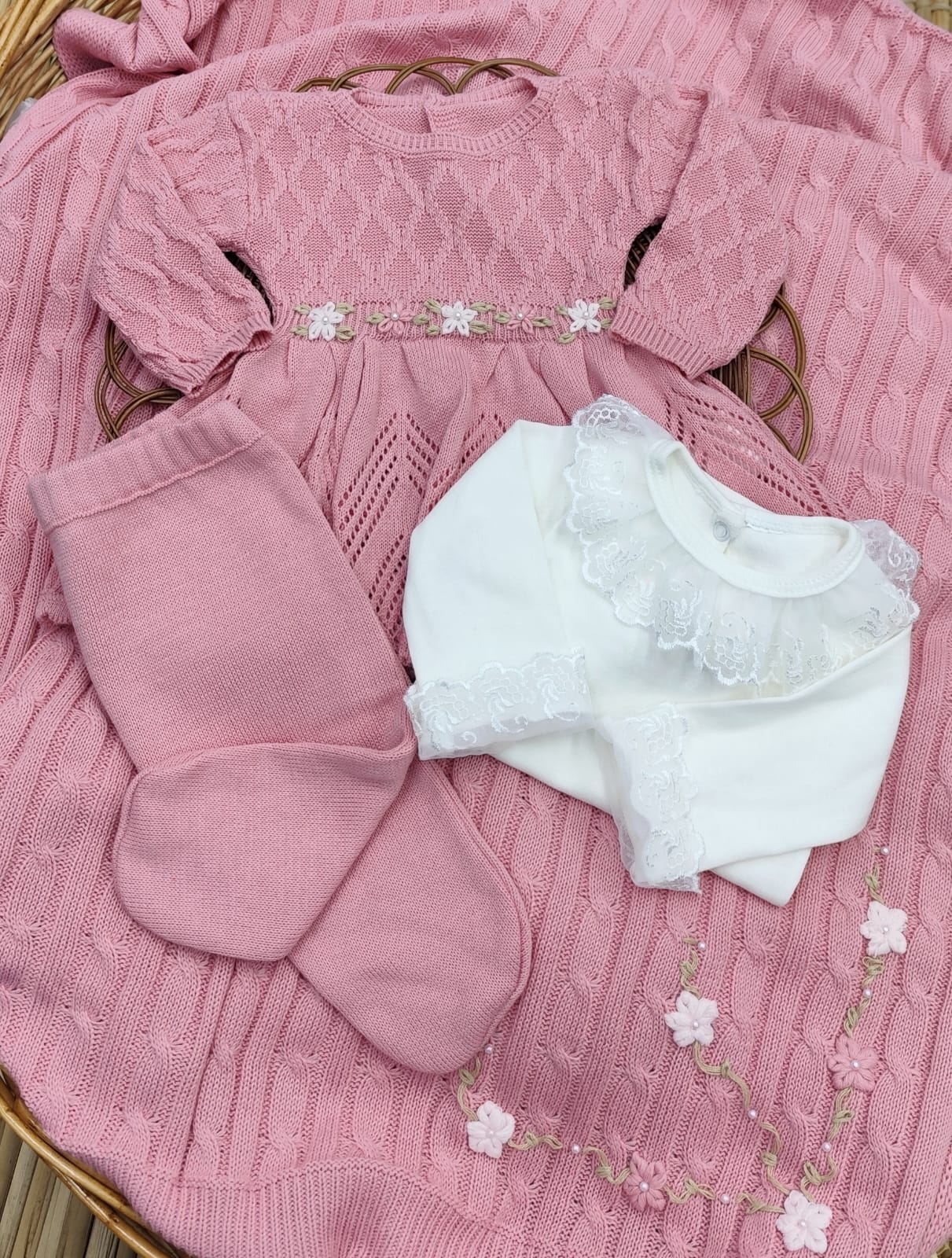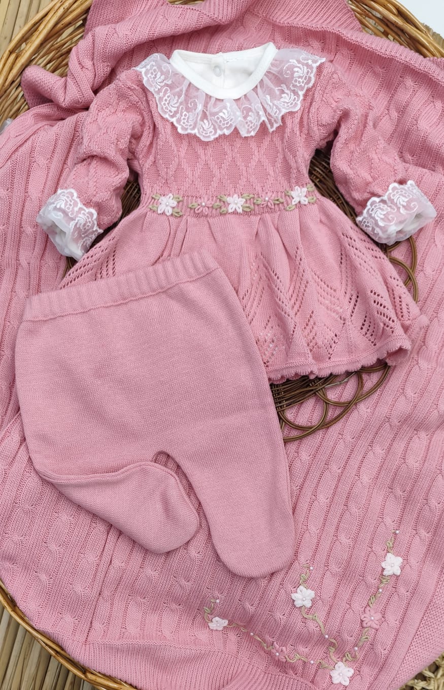 Kit Saída de Maternidade em Tricot – vestido, body com renda, calça e manta.