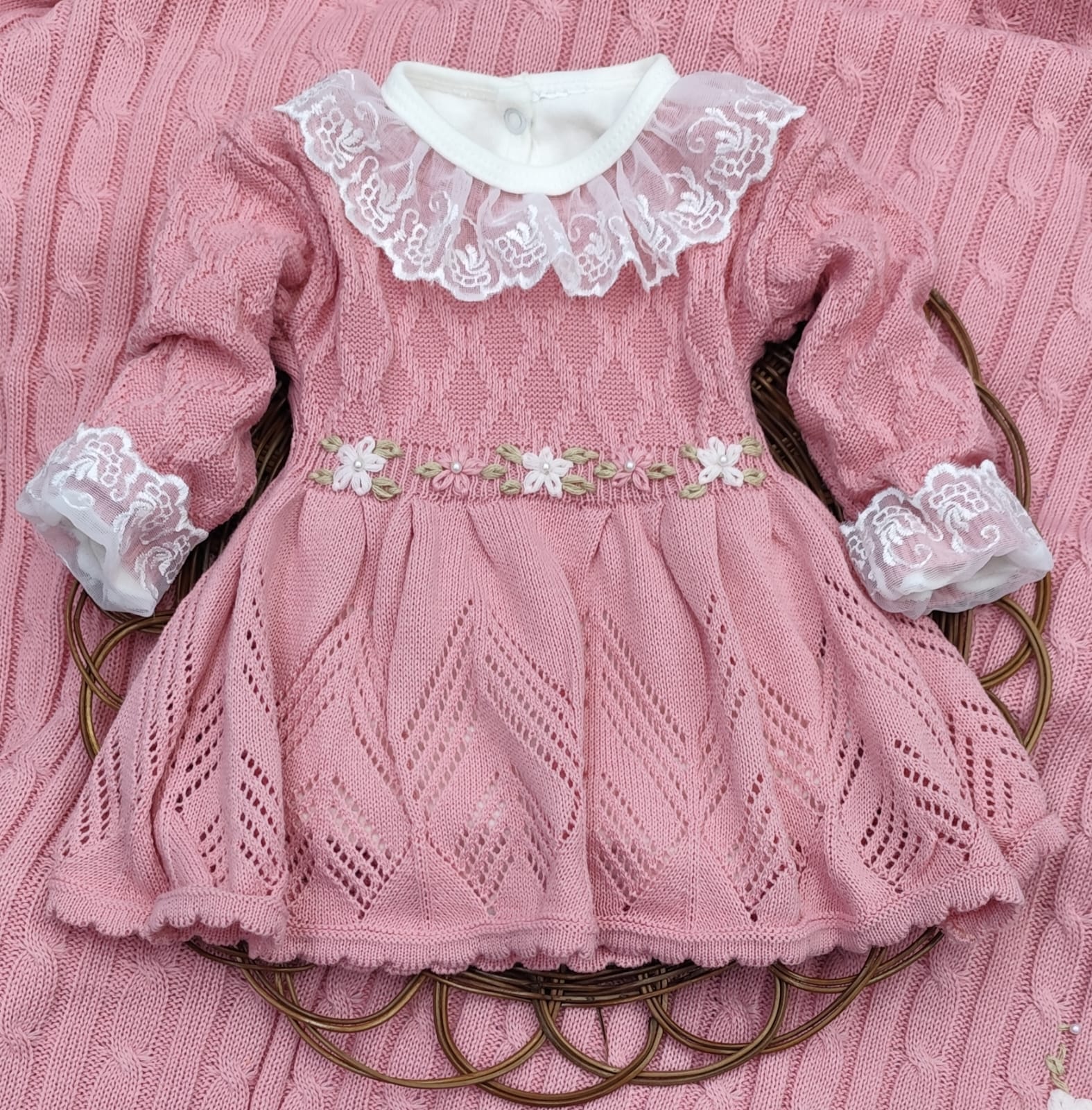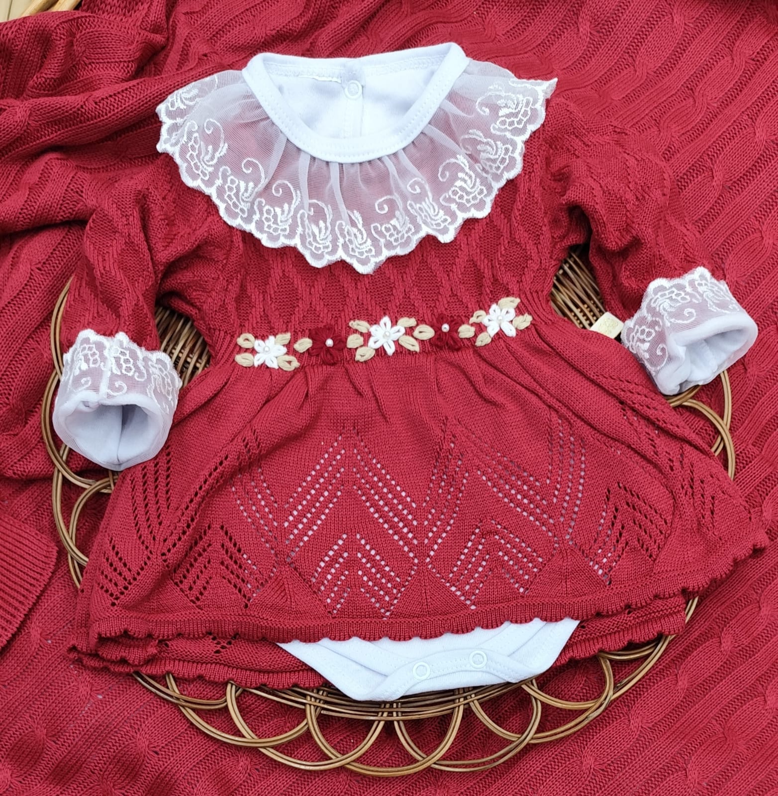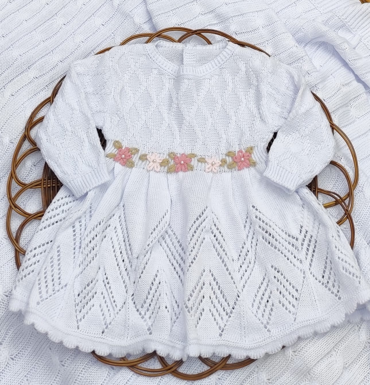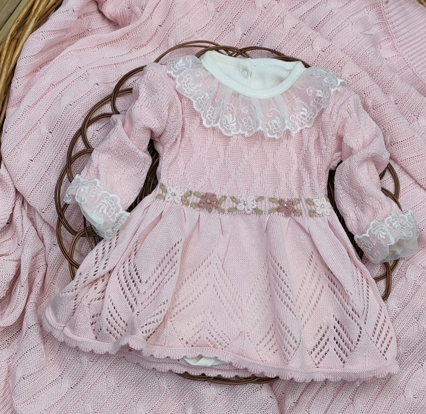 Kit Saída de Maternidade em Tricot – vestido, body com renda, calça e manta.