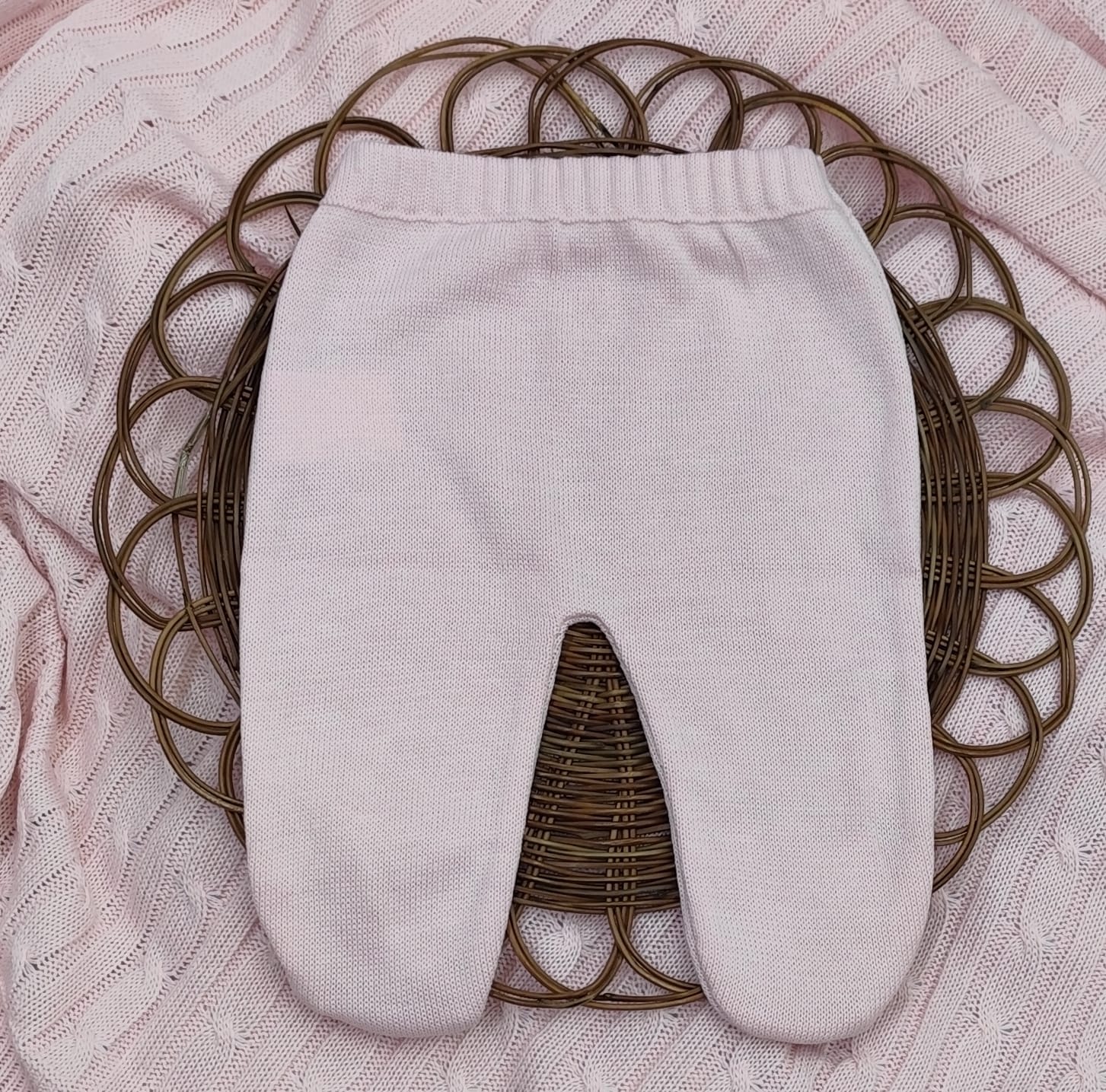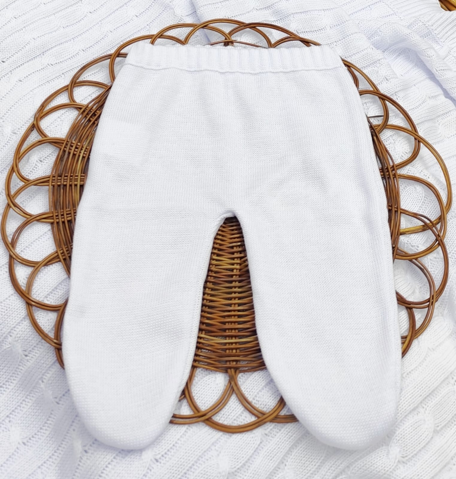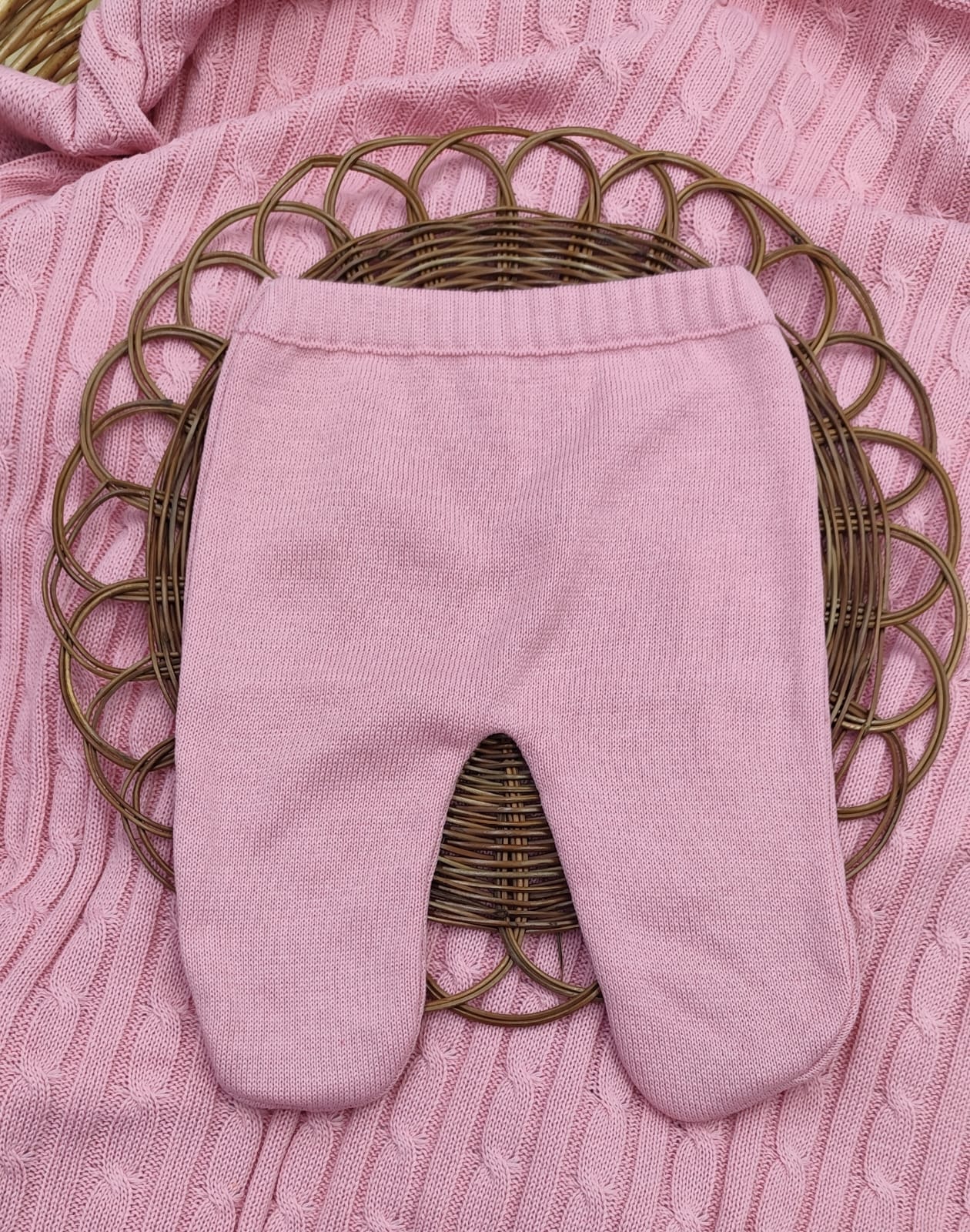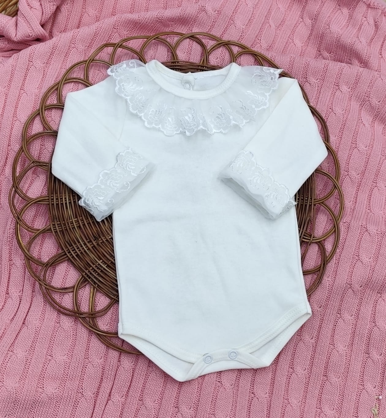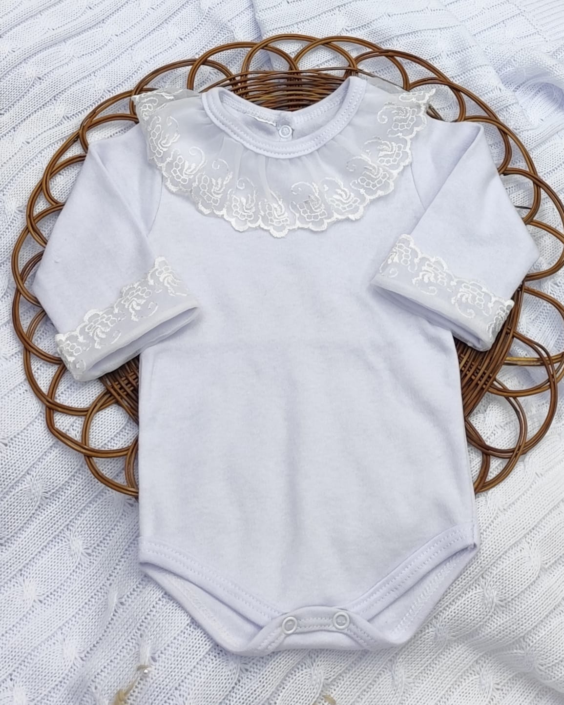 Kit Saída de Maternidade em Tricot – vestido, body com renda, calça e manta.
