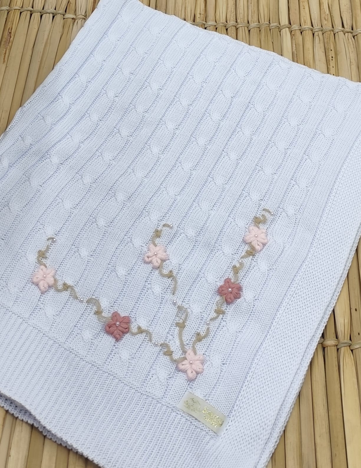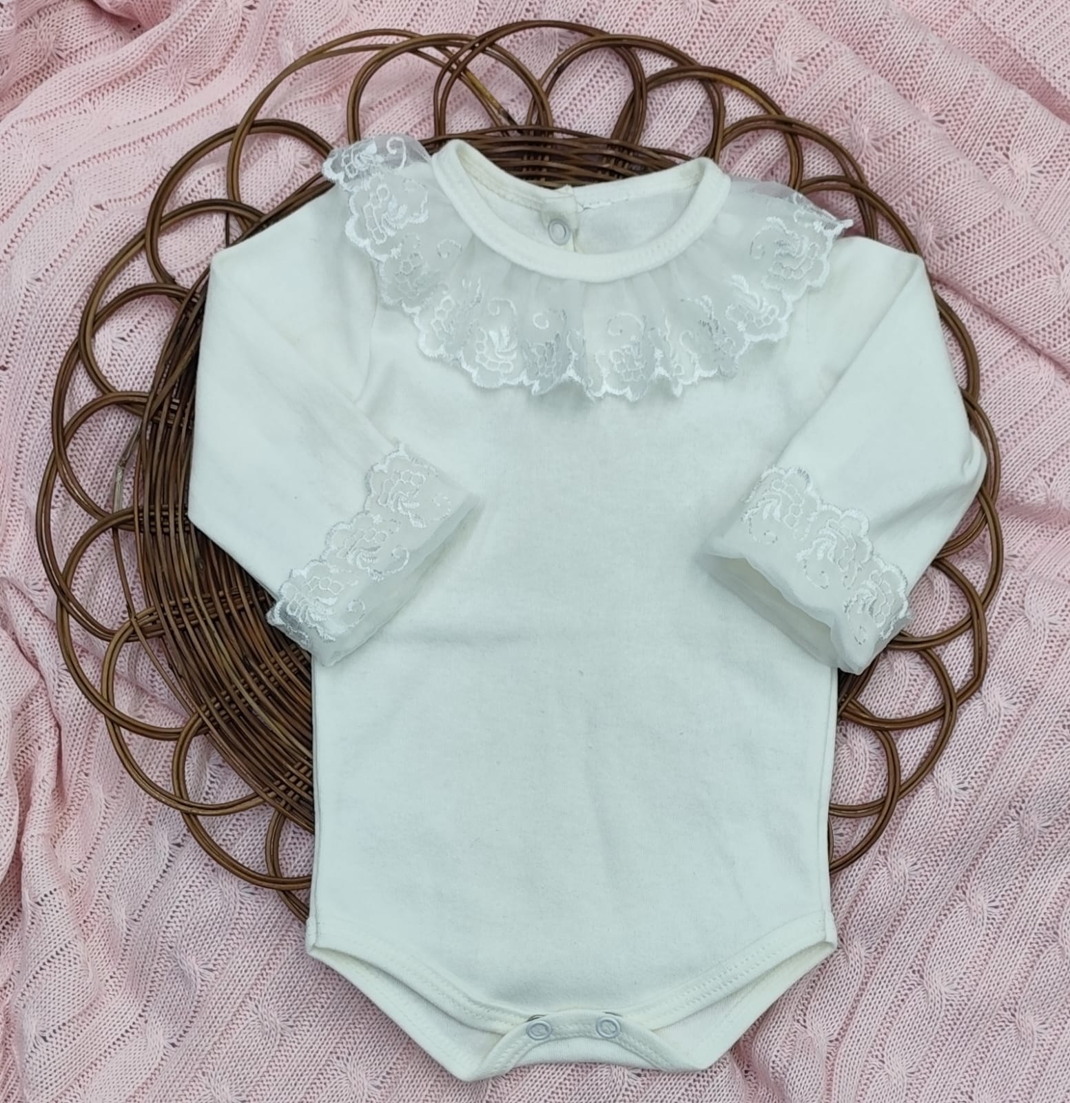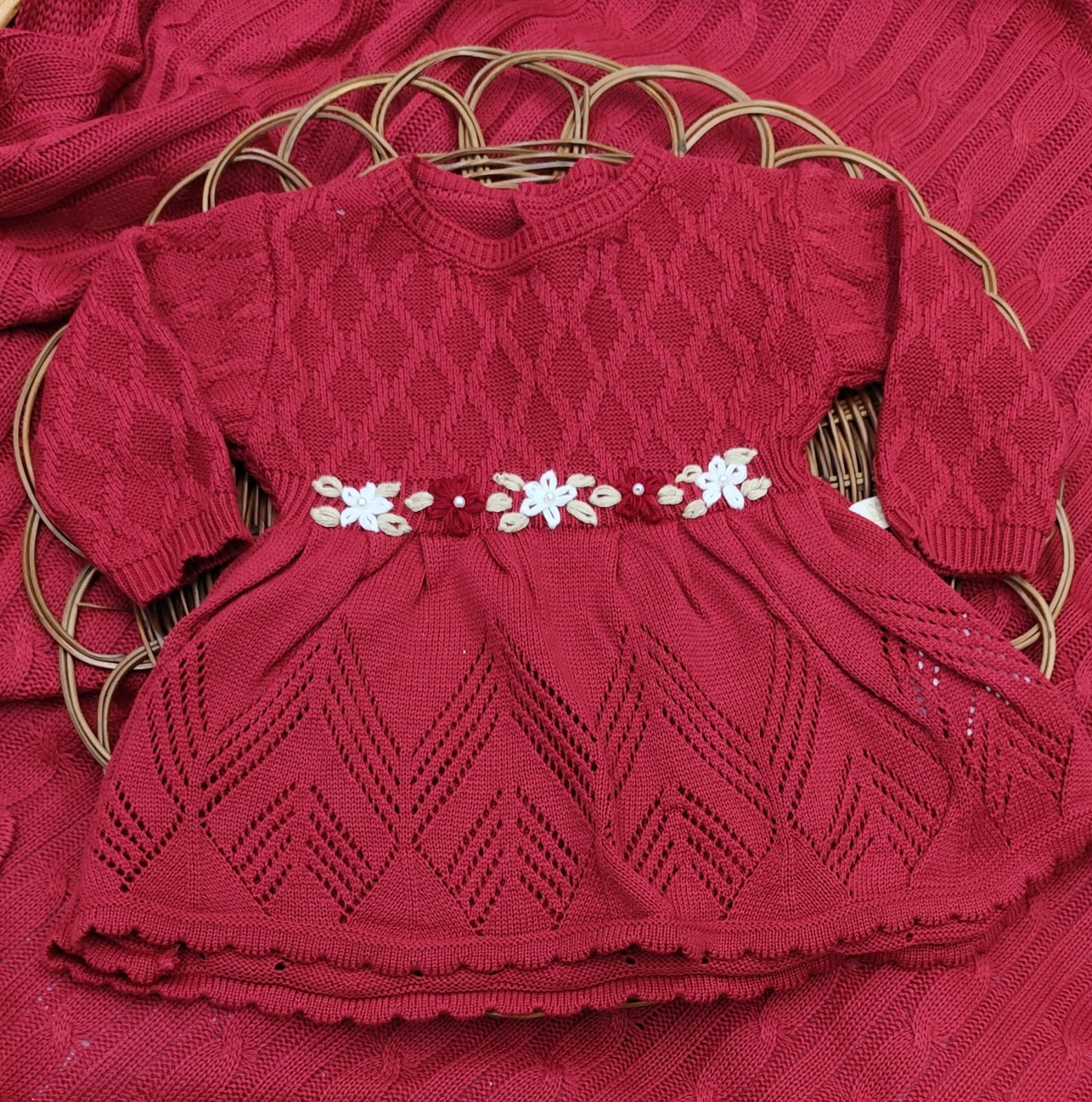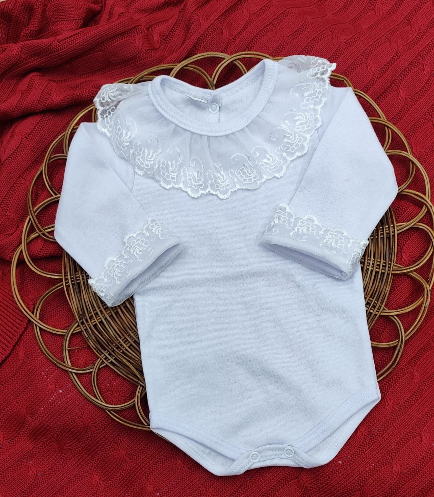 Kit Saída de Maternidade em Tricot – vestido, body com renda, calça e manta.
