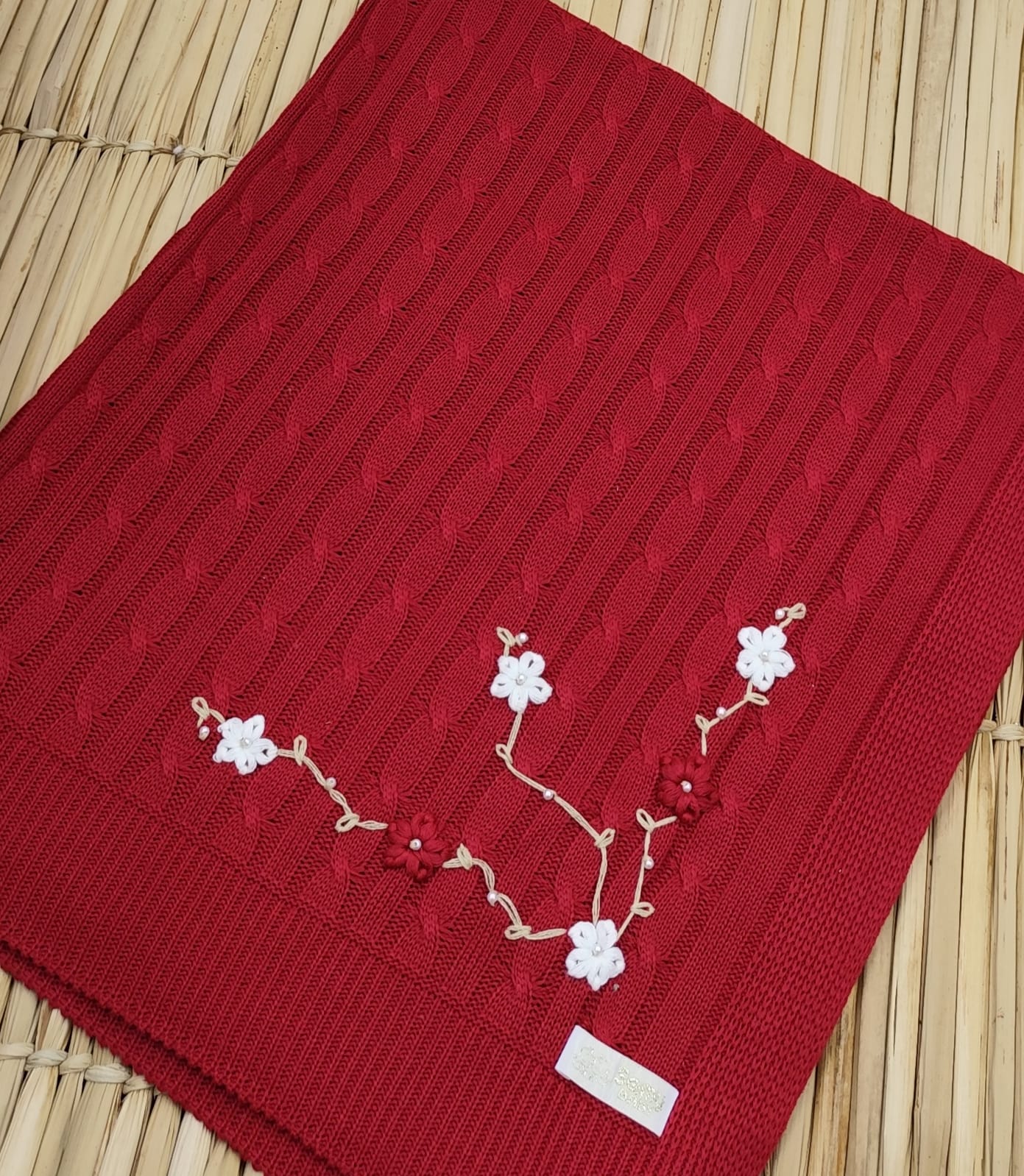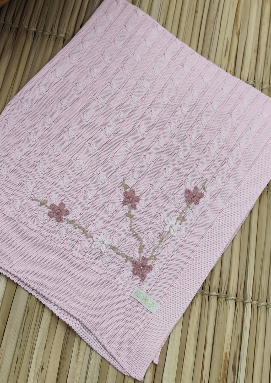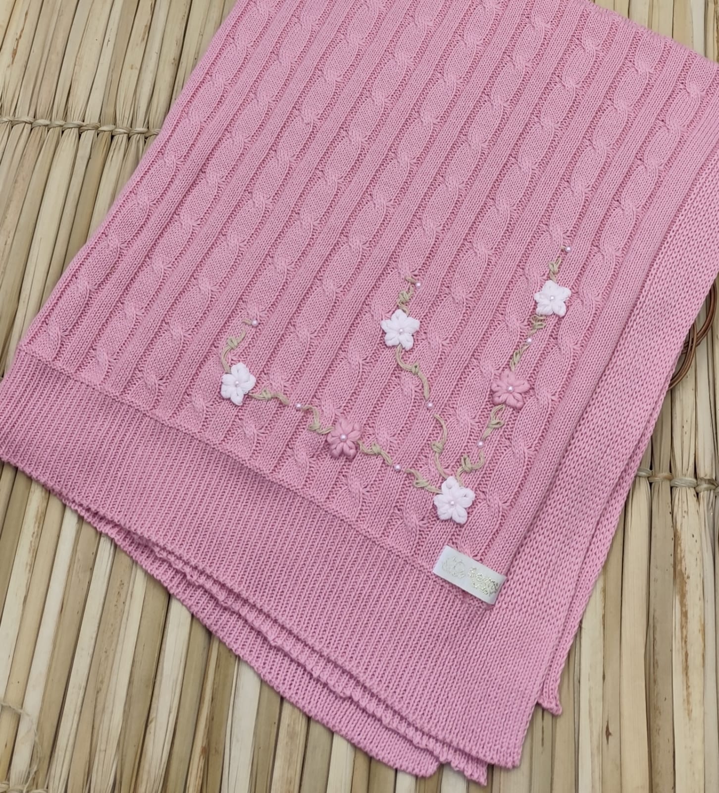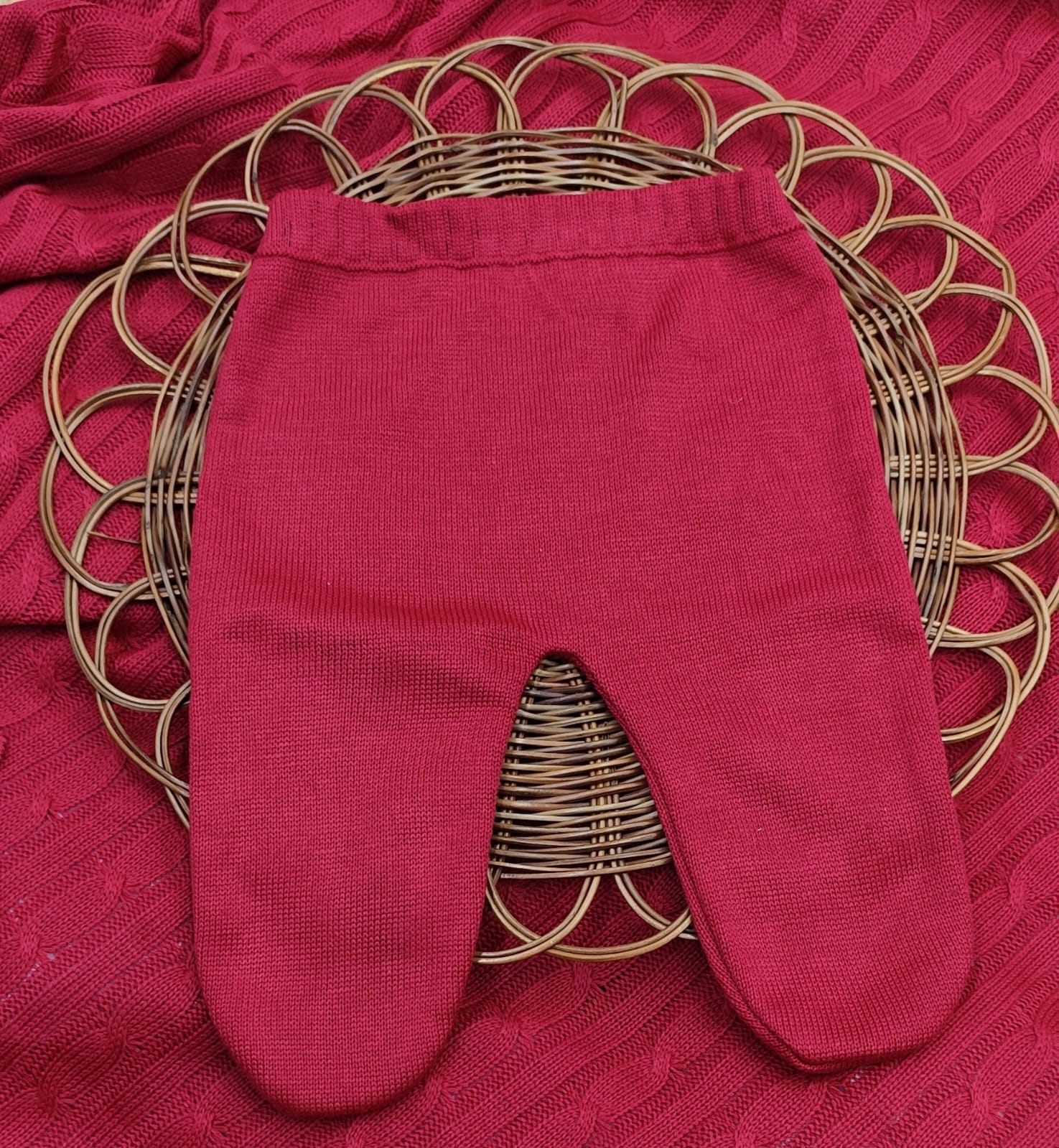 Kit Saída de Maternidade em Tricot – vestido, body com renda, calça e manta.